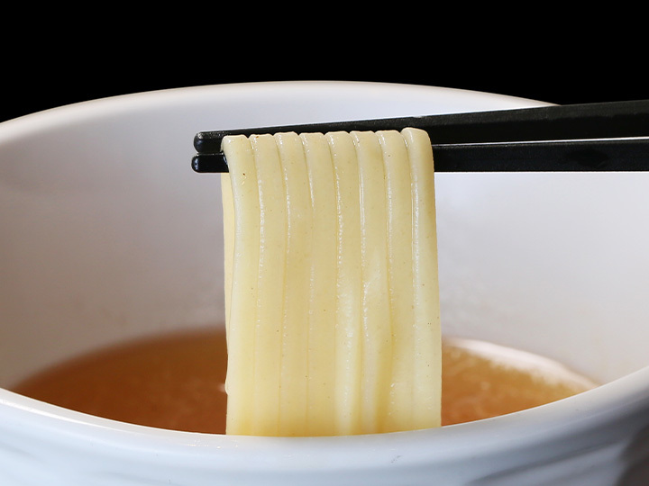 ただ形状に関しては、本来は真っ直ぐな麺線のストレートタイプなのですが、冷凍生麺特有の曲がり癖が付いてしまっており、ウェーブが掛かっています。
