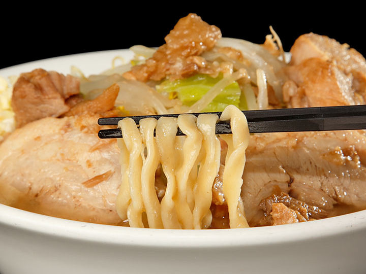 インパクトある自家製極太麺は、濃厚な乳化スープに負けないかみごたえ、喉越しをより堪能するためにも、少し固めに茹で上げるのがおすすめだ。ワシワシゴワゴワとした食感は、まさに口の中で暴れ回る、という表現がピッタリだ。ボリューム満点の豚肉も、柔らかく、ジューシーで抜かりない。一つ一つ、丁寧に食材と時間をたっぷりと使いながら仕上げており、全てがハイレベルな一杯と言える。