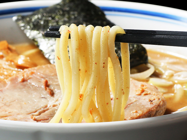 濃厚なスープを持ち上げ過ぎないよう相性を考えた上で、スープを拾いにくい緩ウェーブの太麺を選んでいると思いますが、