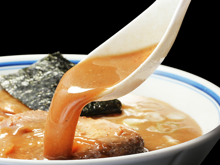 オールドスタイルな一見よく見るスープだが、一口飲めばわかる衝撃的なスープ。豚や鶏からとられた分厚い動物系出汁に支えられたスープに、サバの厚削り節やサバ煮干しサバ粉をきかせ、さらにカエシや香味油にいたるまでサバが使用されている。スープを飲むごとにふくよかな旨みと香りに包まれ、誰からも愛される味でありながらも革新的なスープに仕上がっている。