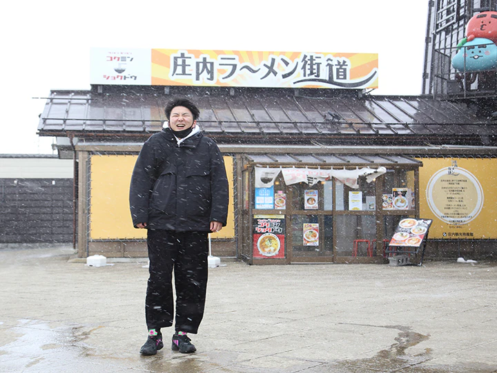 中継地点「庄内観光物産館」に到着。小腹を満たしつつローカルバスを1時間待ちます。とにかく暴風雪で寒い。