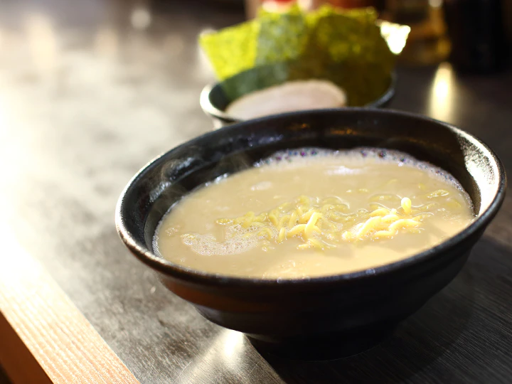 豚骨の扱いを熟知した袴田店主の業と特製の羽釜を用いて作られるスープは、油に頼らない豚骨本来の旨味が堪能できる。