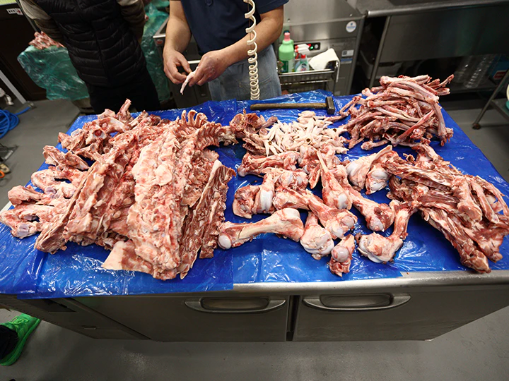 「肩」「ゲンコツ」「メガネ」など、毎朝届けられる7種類以上の新鮮な生ガラ。これだけの量でもまだほんの一部と言うから驚きだ。これらの大量の生ガラを毎日、手作業で下処理しているという。