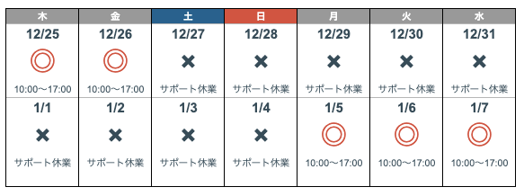 年末年始期間中のお問い合わせ窓口の休業日をご案内いたします。