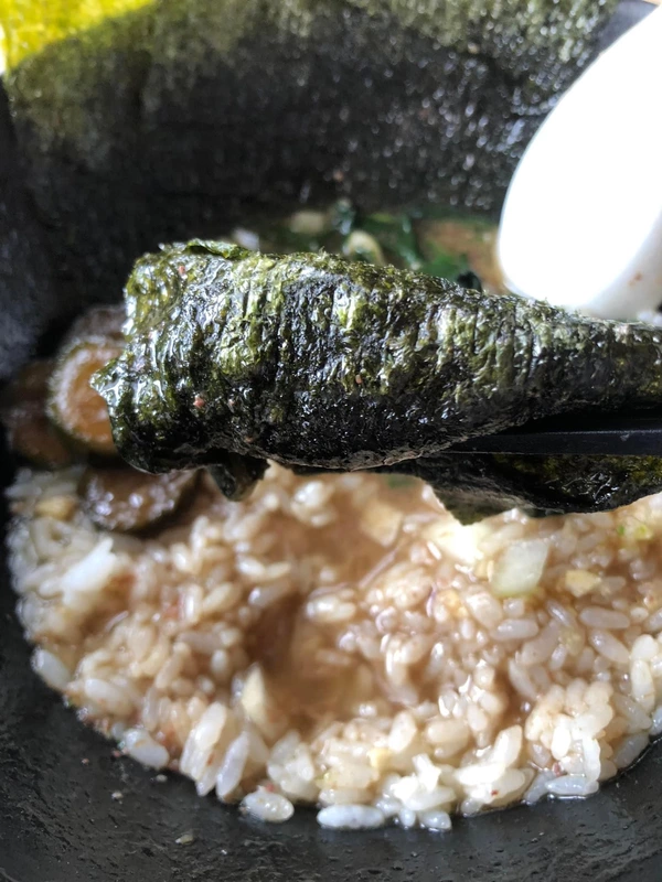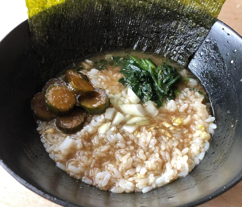 ほうれん草、刻みタマネギ、きゅうりのキューちゃん、ニンニク、白胡麻をトッピングしたライスにスープをぶっかけて、さらにスープに浸した海苔で巻き巻き…。