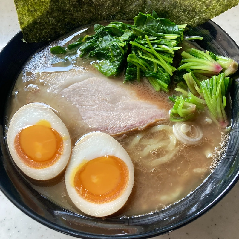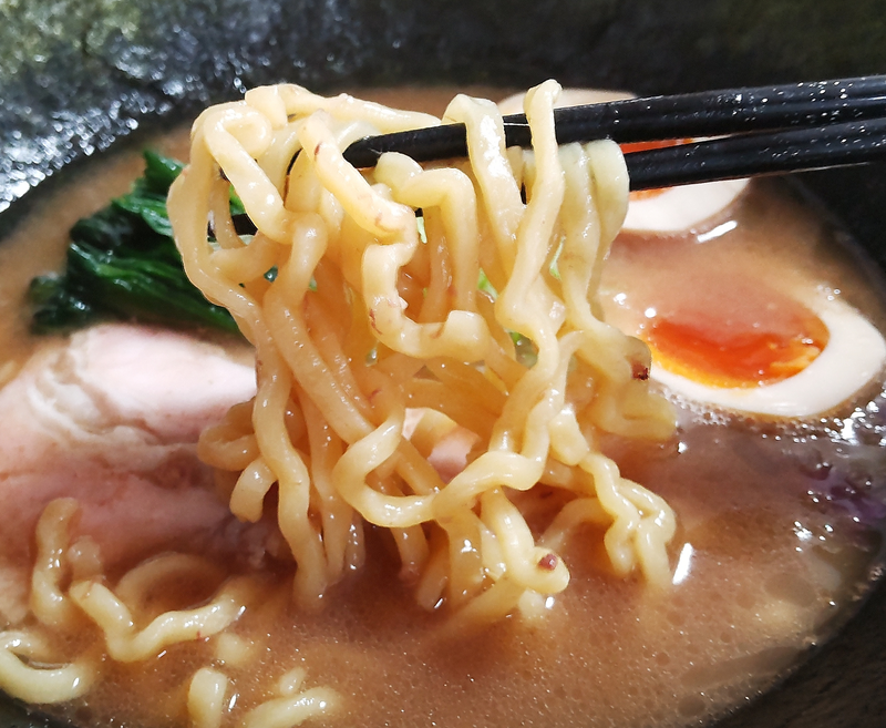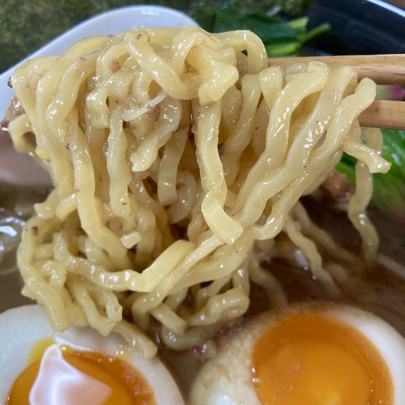 宅麺内では間違いなく家系No.1です。直系特有の醤油先行型でも、鶏油ゴリ押し型の家系でもなく、濃厚な豚骨スープを主役とした三位一体の完成された一杯を楽しめます。