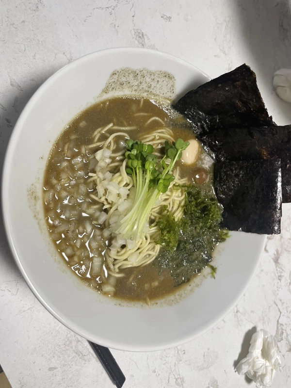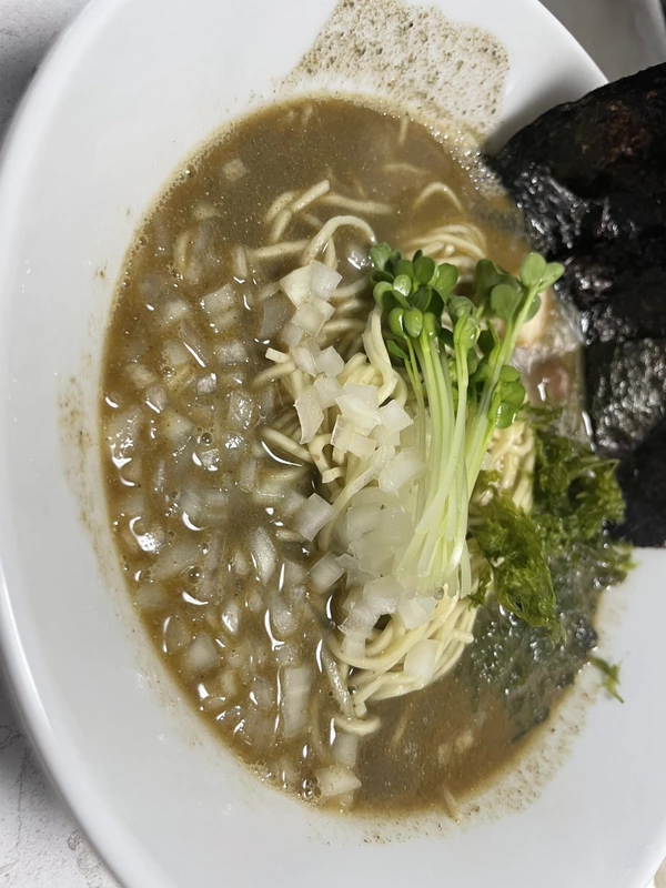 煮干し100%でありながら強すぎるえぐ味等を殆ど感じない美味さ。見た目ほどのクドさもありません。かと言って物足りなさも感じない。