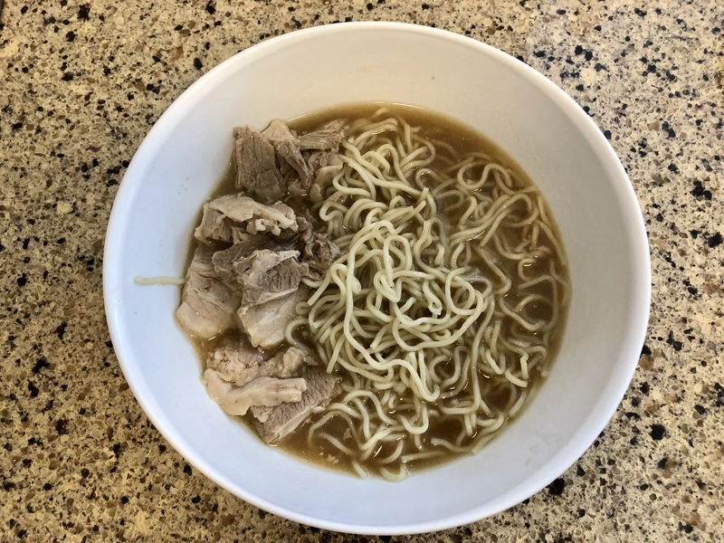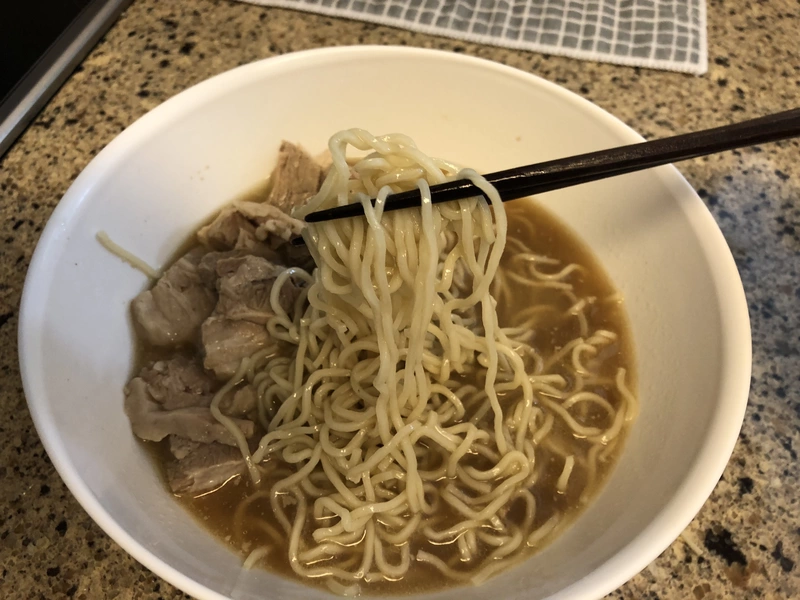 麺は自家製の低加水角刃中細ストレート。熱湯3リットルの40秒ボイルで実店舗のザクパツ食感を再現出来ましたが、茹で時間が短すぎると内部までα化が進まず生煮えになるので注意です。