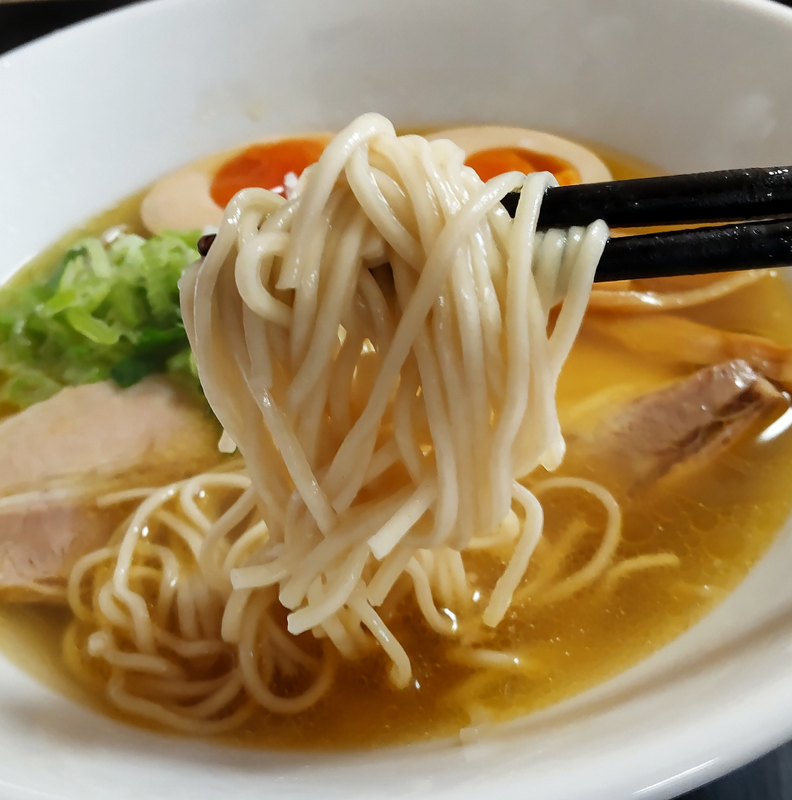 麺は、パツンと歯切れがよく、ツルツルとし喉越しが気持ち良いタイプの低下水中細ストレート麺。ラーメン店での修行なく、自己流で行列店を作り上げた店主が、麺とスープの相性にとことんこだわり、行き着いた麺だ。サラリとしたスープにも、しっかり絡むよう計算しつくされている。噛めば噛むほどに、滲み出てくる小麦の香りと、旨みをまとったスープのマリアージュをご堪能ください。