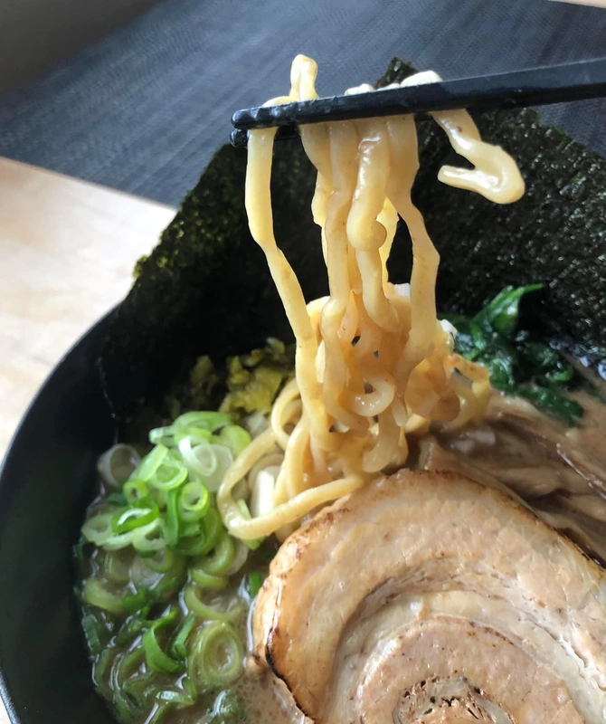 濃厚ドロドロ豚骨スープとの相性を考えて作られたオリジナル中太ストレート麺。ツルツルとした喉越しにワシワシとした食感、更にはもっちりした歯応えが特徴。粘度抜群のスープをしっかりとすくい上げ、スープに負けないインパクトを誇る。見た目とは裏腹に、後味のすっきりしたスープと同様、麺も力強さはありながらも、必要以上に主張することなく、スープとの相性がよく考えられている。