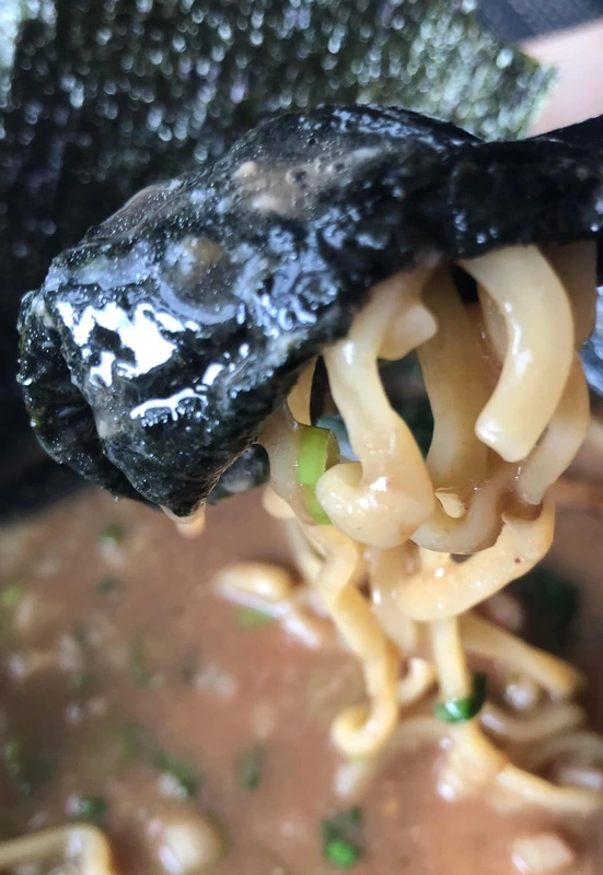 追加トッピングは九条ネギとタマネギとほうれん草、そして海苔。刻みタマネギはスープと相性ぴったりなので、面倒でも用意しておきたいトッピングの一つ。平打ち中太の麺は茹で時間4分ちょっとでやや硬めのモチモチ食感。具材はやや厚みのあるロールチャーシューと、柔めのメンマ。チャーシューは側面は柔らかく美味しいが、中央に行き次第パサつきが気になった。スープは無鉄砲イズムをしっかり継承。豚骨臭はわずかに感じさせながら、飲んでみるとかなり豚骨が濃厚ではあるのだけれど塩味は強く無い。それほどクセを感じさせない仕上がりとなっている。