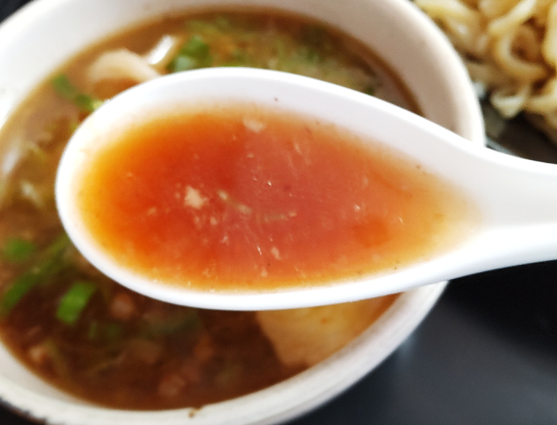 同じ魚介系でも、醤油の風味が強いさらっとしたつけ汁は、甘味と酸味が前面にあり、その奥にかすかに感じるピリ辛。