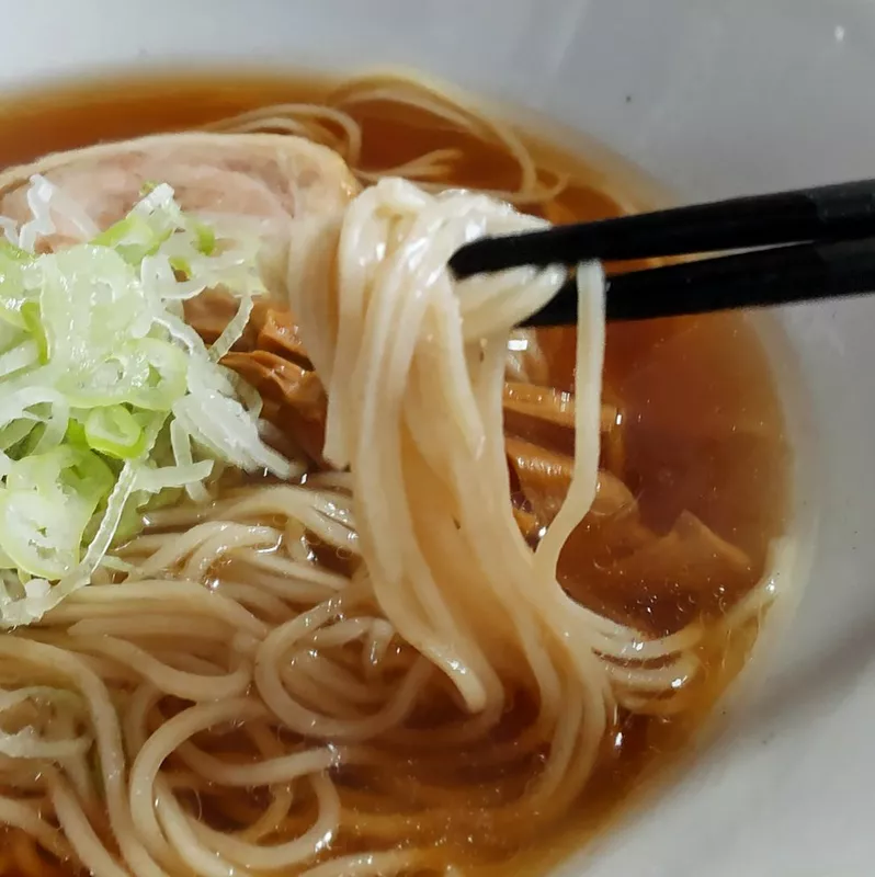 銀河のちからを中心に岩手県産小麦を100%ブレンドした、喉越し良し、香り良しの自家製麺。加水率高めの艶と歯ごたえのある麺はスープの油を適度にすくって輝きを放ち、抵抗を受けることなくスルスルと口内へと運び込まれる。つるっと舌触りも良く、秋刀魚の風味をほんのりと纏い小麦の香りとともに優しく語りかけてくる。この麺とスープの親和性は計り知れない。