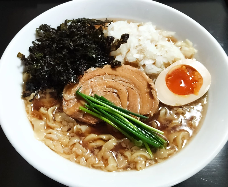 追加で刻み玉ねぎ、あさつきとばら海苔、半熟味玉。