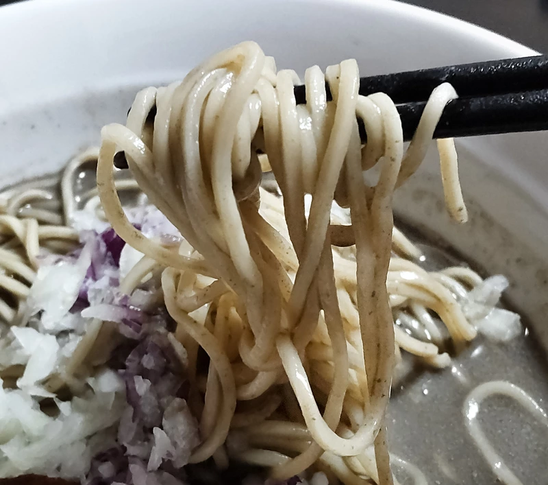 麺はストレートの中細麺。低加水ぽっきん麺の歯切れのよさにコシの良さはいうことなかれ!のど越しもスルスルイケて良し!絡み吸い付きはしっかりスープを吸って乗せて良し!麺量は適量。間違いのないもので旨し!