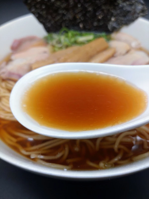豚ゲンコツ、鶏ガラ等、動物系の旨味プラス煮干しが加わったスープに甘みのある醤油ダレを合わせると、濃い色ながら塩味はそれ程強くなく最後まで飲み干せます。低加水細ストレート麺は喉越し良く、啜るたびに麺の旨さが感じられます。トッピングの薄切りチャーシューと極太メンマもそれぞれ良い味付けと歯応えです。店主のワンポイントアドバイスに従って、半分程食べた後にお酢を少し加えると良い味変となって最後まで楽しめます。