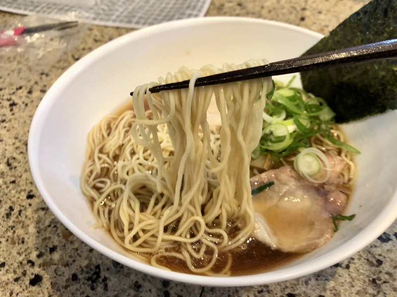 あっさり醤油清湯ですが、香味油がやや多めに浮かんでおり、口当たりは軽すぎず重すぎず。
