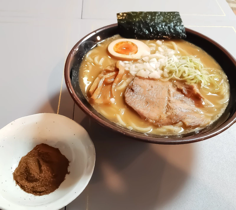 動物系と魚介の良い風味香る少しトロミのあるスープは意外とあっさりながらそれぞれの旨味も十分に感じられます。丸ストレート麺はモチモチで喉越し良く量も190gと食べ応えがあります。豚肩ロースチャーシューは柔らかくメンマも良い歯応えです。付属の魚粉を全部混ぜると一気に魚に味が傾くので混ぜる前との落差に注意が必要です。個人的には半分位が好みです。店主のワンポイントアドバイスに従って胡椒·ラー油を加えると旨味がアップします。何度も味変を楽しめる一杯です。