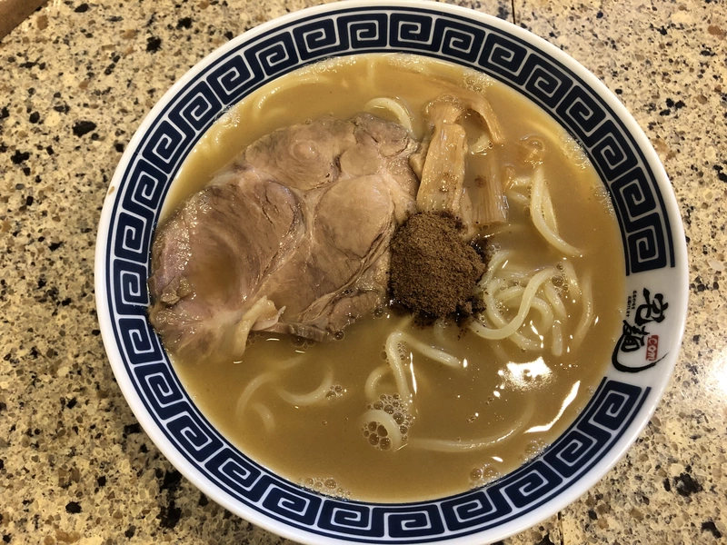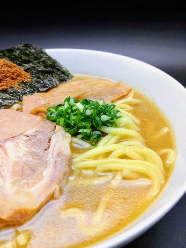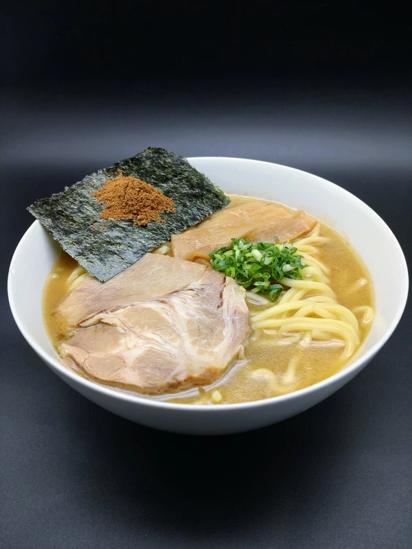 動物系と魚介の良い風味香る少しトロミのあるスープは意外とあっさりながらそれぞれの旨味も十分に感じられます。丸ストレート麺はモチモチで喉越し良く量も190gと食べ応えがあります。豚肩ロースチャーシューは柔らかくメンマも良い歯応えです。付属の魚粉を全部混ぜると一気に魚に味が傾くので混ぜる前との落差に注意が必要です。個人的には半分位が好みです。店主のワンポイントアドバイスに従って胡椒·ラー油を加えると旨味がアップします。何度も味変を楽しめる一杯です。