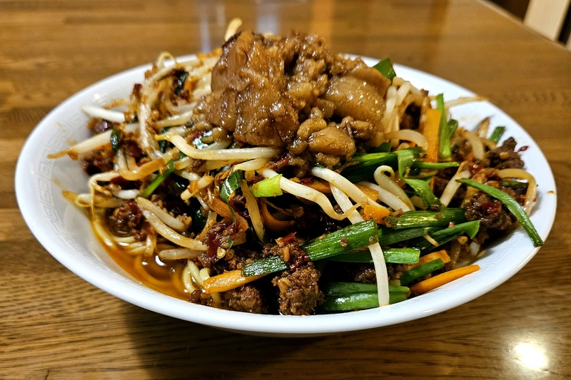 タレは濃い口の醤油ベースで、ニンニクと唐辛子の効いた付属の辛口挽き肉と自前のもやし&ニラを炒めて調理します。