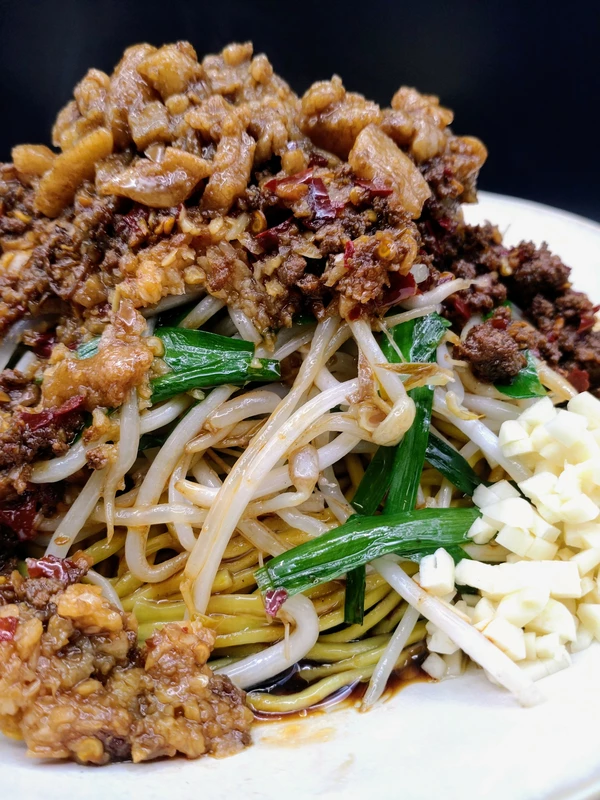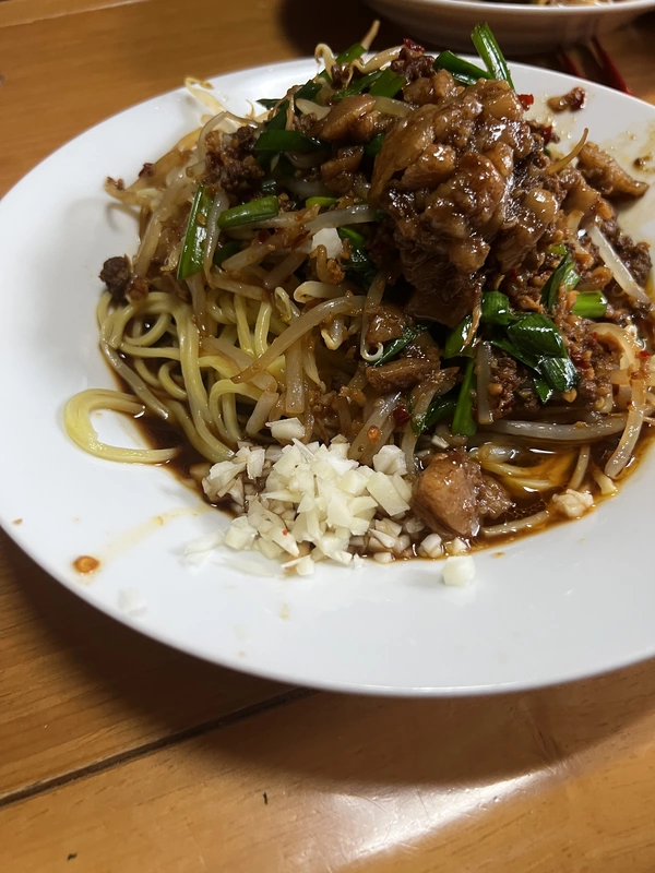 諸先輩方の御指南通り、1人前モヤシ量を、レシピ推奨の200gでは無く400g(2袋)に増量し、ピリ辛挽肉とニラと共にシャキ感を残しながら、中華鍋で炒めたら…麺の上にドーン。