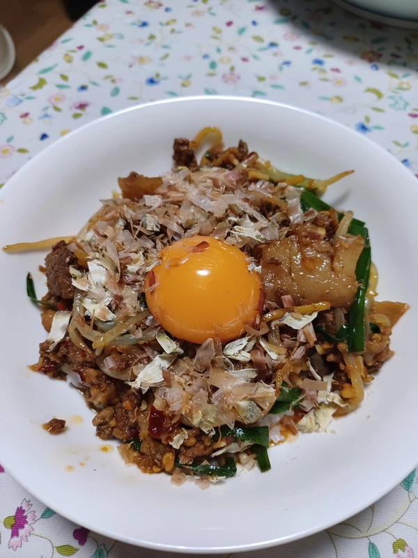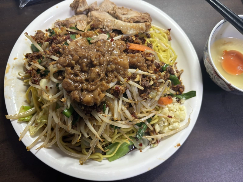 適度に歯応えのある麺にシャキシャキ野菜とジャンキーなタレ。そしてかなりの量の挽肉はご飯なしではダメ!マイルドに味変の生卵はオススメです