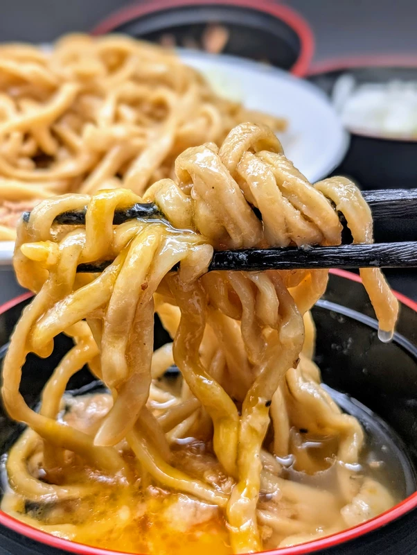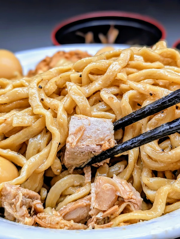 表面のツルっとした舌触りが心地良く、力強いモチっとした弾力が特徴の自家製平打ちの極太麺。咀嚼するほどに小麦の香りが鼻腔を抜け、甘辛いタレと見事に調和する。具材はゴロゴロのチャーシューが大量に入っており、麺にも負けないボリュームだ。噛めば噛むほど旨みを感じる豚肉と特製のタレで更なるブーストをかけた自家製麺の味わいをご家庭でも味わってほしい。