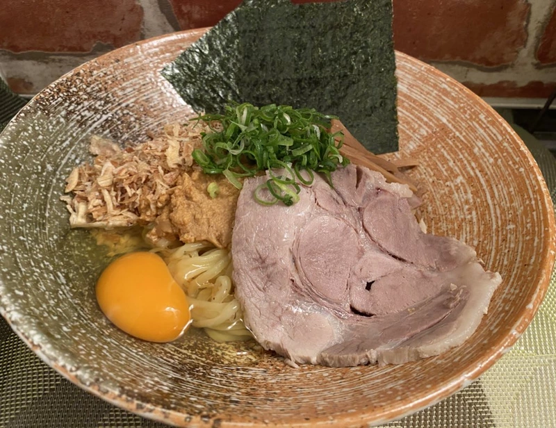 あん肝の臭みを一切感じさせないクセのない味わいにして、どこまでも濃厚なこちらのまぜそばは、食べたものを覆麺ワールドへと誘う。店舗でも大人気の限定まぜそばは、朝からここでしか味わえない一杯を求め長蛇の行列を作り出す。ケチケチせずに、思い切り楽しんでもらいたい、という店主の想いを乗せ、尋常ではない大量のあん肝を贅沢に使用。ド濃厚なあん肝ペーストは、覆麺特製塩ダレと煮干しの風味をまとった香味油と相まり、経験したことのないような旨みが口内から溢れ出す。生卵、海苔、万能ネギをトッピングし、終盤は付属の割スープでさっぱりしたラーメンへと味変、最後は残ったタレに白飯を入れ、最後の最後までお楽しみください!