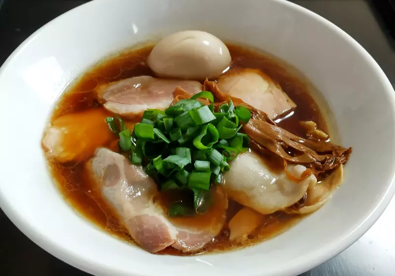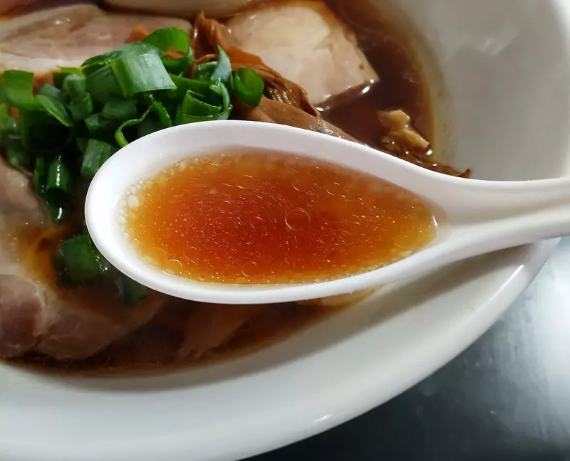 鮮やかなビジュアルのスープを1口啜ると香り高い鶏油と鶏や豚から抽出した出汁の旨み、更にはスッキリしていながら味わい深い醤油のキレ・コク・香り、全ての絶妙なバランスが織りなす、究極の鶏清湯醤油スープだ。食材にはとことんこだわっており、ブランド地鶏と名高い「丹波どり」を使用し、タレに使用する醤油は10種類以上のこだわり抜いた醤油を店主自らのブレンドで作り上げている。