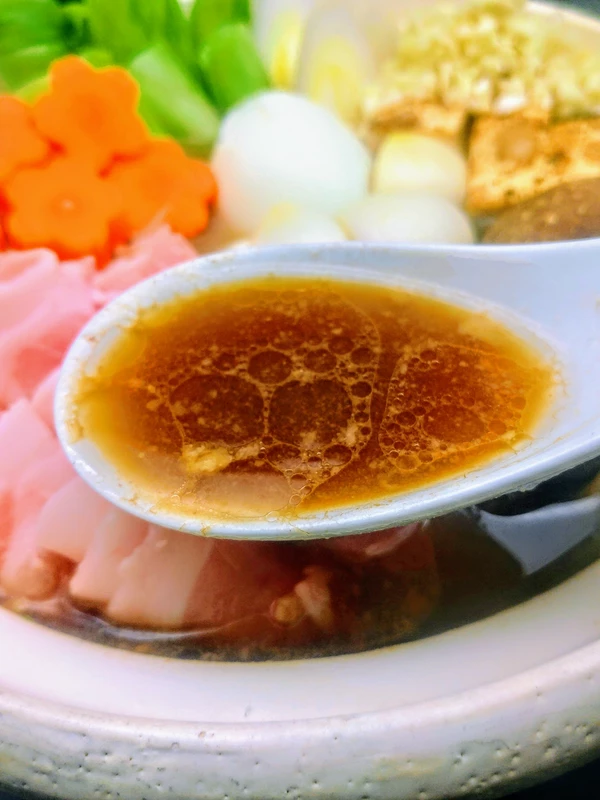 ラーメンスープは麺を食べさせる為に醤油のキレを出してありますが、鍋スープは野菜に合うように醤油のエッジを円くした印象です。