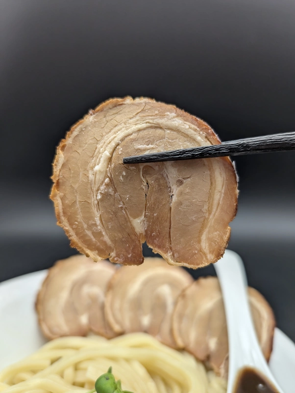 付属トッピングは実店舗とは別タイプの炙り豚バラロールチャーシュースライスが4枚。濃口の甘辛タレで味付けが施されています。