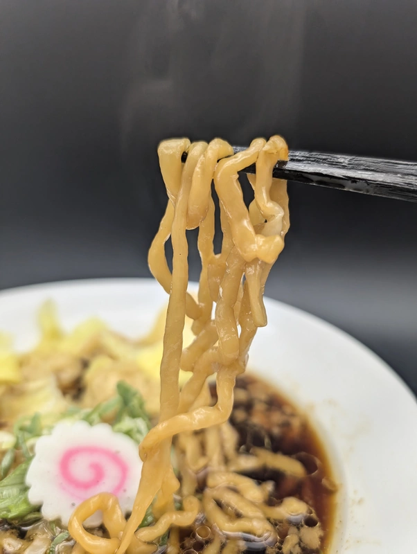 表面は滑らかで、ツルモチの弾力とふんわりとした柔らかみ、穏やかな甘みがエッジの立ったスープと調和しています。