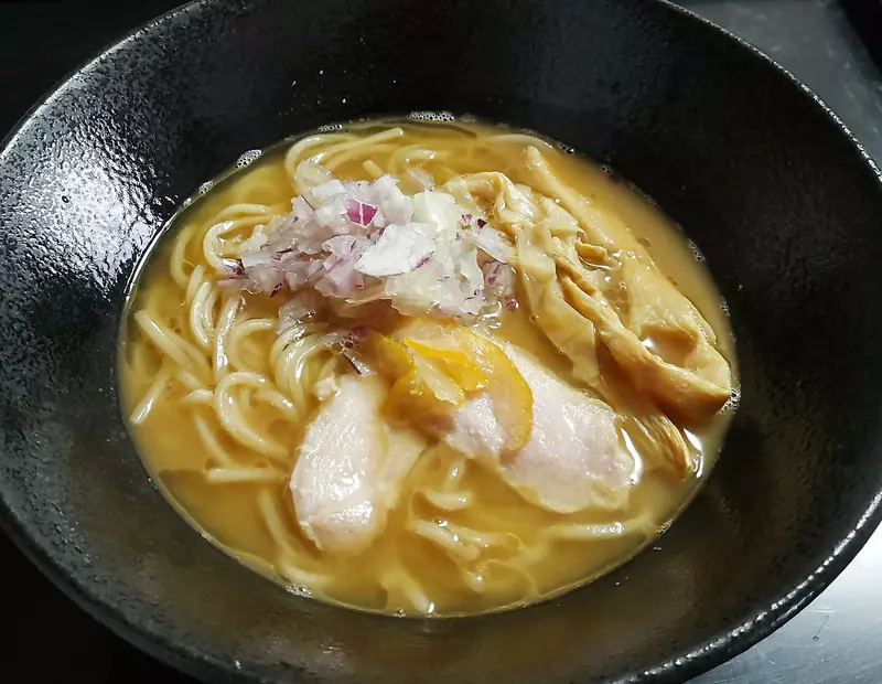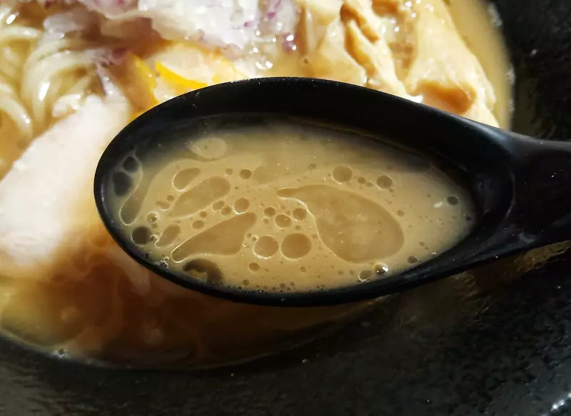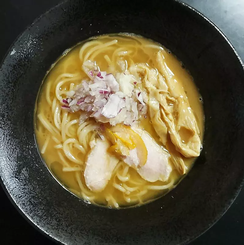 具材は鶏ムネチャーシュー、穂先メンマ、柚子。