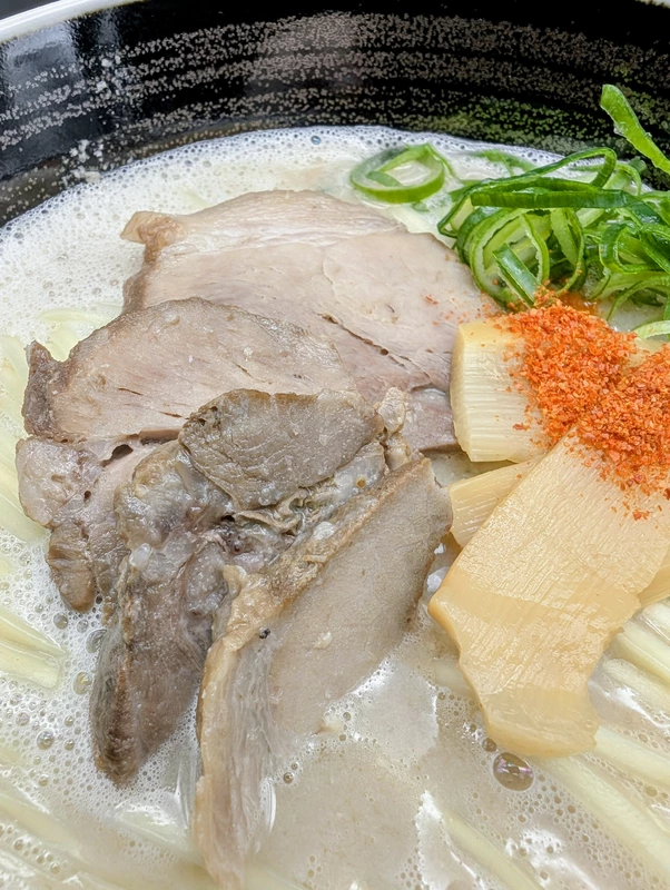 付属トッピングはInスープの豚肩肩ローススライスが2枚。実店舗と異なる煮豚タイプで、適度な弾力と味付け。