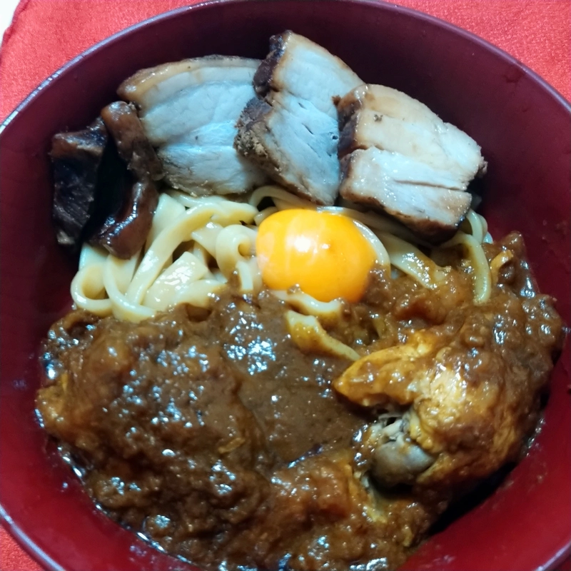 麺( 小麦粉( 国内製造) 、卵、かんすい)、カレー( 鶏肉、玉ねぎ、トマト、生姜、にんにく、バナナ、りんご、セロリ、牛肉、豚肉、牛乳、醤油、清酒、マンゴーパウダー、酢、昆布、ホタテ貝柱、鰹節、さば節、カカオ、砂糖、食塩、片栗粉、香辛料)、具材( チャーシュー( 豚バラ肉、清酒、みりん、醤油、酸味料))、かえし( 醤油( 国産)、清酒、みりん、砂糖、酢)、( 一部に小麦・卵・乳成分・牛肉・豚肉・鶏肉・さば・大豆・バナナ・りんごを含む)