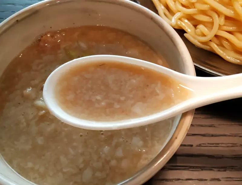 豚の旨味が凝縮されたつけ汁は大量の背脂の甘味と強い塩味がパンチのある仕上がりとなっています。中太ストレート麺は適度な歯応えとモチモチ感で喉越しも抜群です。バラチャーシューは柔らかく、メンマはシャキシャキです。おすすめトッピングの刻み長ねぎを加え、食べ終えた後は店主のワンポイントアドバイスに従っておじやにして堪能しました。