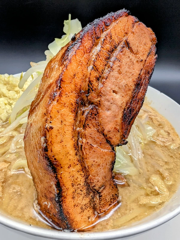 付属トッピングは豚バラブロックが1つで、実測(個体差あり)長さ約12cm、幅約5cm、厚さ約3cm、重量約140gもある大迫力のジャンボサイズ。