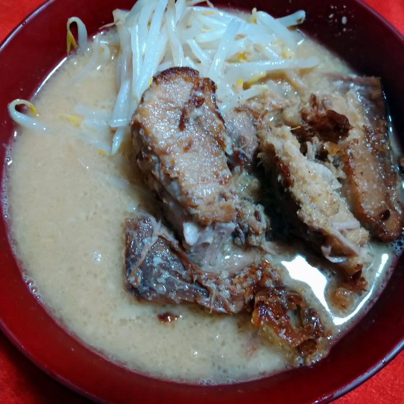 美味しい味噌ラーメン。もやしを200g入れて食べられるけど、そこまで濃いわけでもなく脂も少ない。冷やしても固まらない。麺はワシワシよりツルツルという感じでこれも二郎系ではなく太めの味噌ラーメンの麺。チャーシュー130gはホロホロで表面を焼くとカリッとしてホロっとして美味しい焼く時ひっくり返しにくいくらい柔らかいが、トロトロではなく赤身の繊維が縦に切れない感じのホロホロ。麺が少ない。