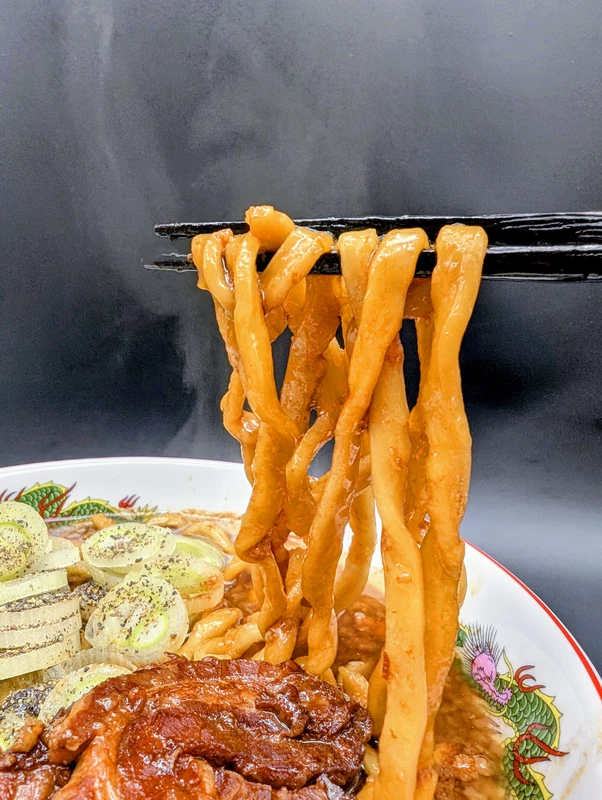 麺は燕三条系の王道である極太平打ち縮れ麺を使用しており、二郎系のようなゴワゴワとした食感が味わえる。弾力はすさまじく、噛みごたえ・食べごたえ抜群。麺の縮れがスープをキャッチして離さないので、麺とスープのパンチ、それらの相性の良さを存分に享受できる。小麦の香りがスープに負けじと感じられ、食べているあなたを大いに楽しませてくれることだろう。