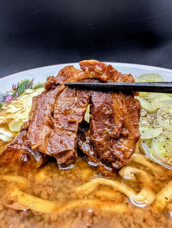 付属トッピングはI豚バラロールチャーシューが2枚で、Inスープの為こちらも真っ黒に染まっています。