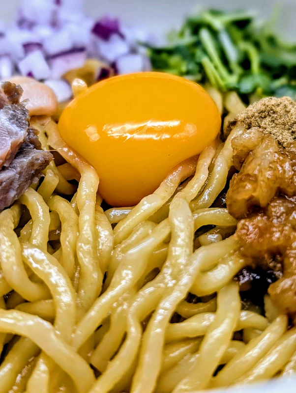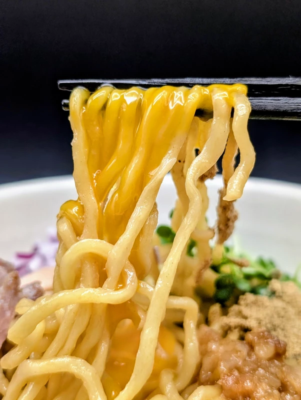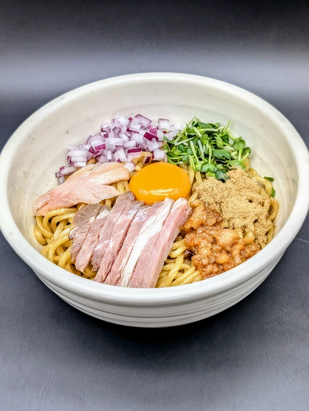 こちらは宅麺でも販売されている人気店、つきひ@亀戸のプロデュースした油そばとなっており、つきひらしい煮干の風味と旨味が凝縮した味わいとなっています。