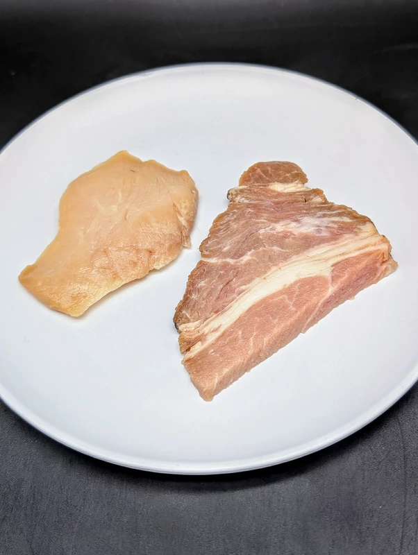 しっとり瑞々しい鶏胸肉と軟らかくも弾力のある豚肩ロースが1 枚ずつで、拍子木切りにすると麺に絡みやすく、卵黄と和える事でユッケのような味わいになります。