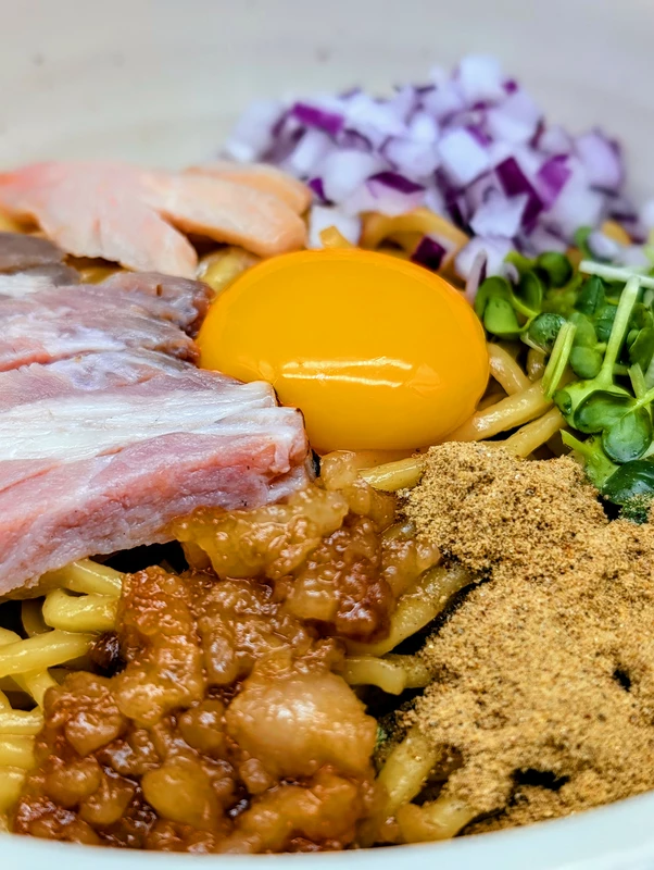 追トピ無しだと油分が強く主張し、商品本来のバランス感が崩れてしまうため、最低でも卵黄、玉葱の2つだけは加えたほうがよいです。