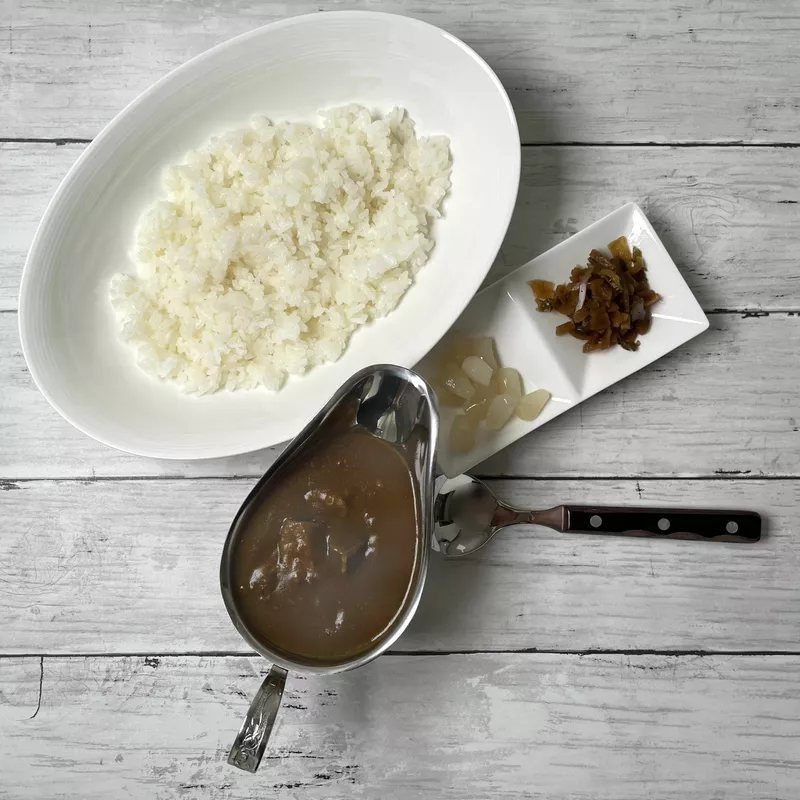 バターライスはバターを主張しすぎない控えめなタイプなのが入っている。ルーは見た目で日本式かと思ったけどさすが人気店のカレーで甘めと思わせて後から辛みが来る仕掛けで一味違う印象。ブロック牛はほろほろ柔らかく、自分でカレーを作る時も大体こんな大きさで入れるので何かまた作りたくなりましたがさすがに自分では作れないカレーの味でした。添付の副新漬けとらっきょうは湯煎じゃないのでこだわる方は前日からの解凍などスケジュールに余裕が必要かも。