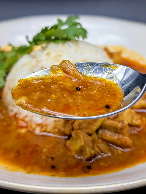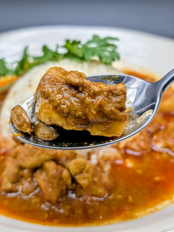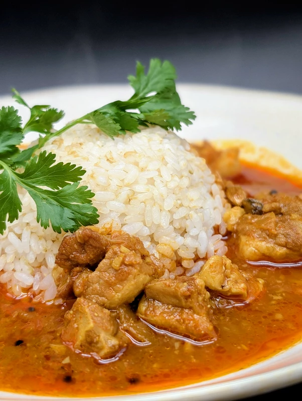 具の豚バラ肉は一般的なポークビンダルーのようなワインビネガーや穀物酢ではなく黒酢で漬け込まれており、食感はもっちり軟らかく、刺激のないマイルドな酸味とコクのある味わいとなっています。