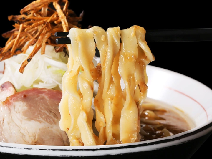 こだわりの自家製麺は、北海道産優良品種の小麦『ゆめちから』をメインに『はるゆたか』『きたほなみ』『農林61号』等を季節ごとにブレンドしており、小麦の風味の豊かさと程よいコシが特徴的で濃厚スープに負けない存在感を放つ。また、ウェーブがかった麺が濃厚味噌スープをしっかりと絡ませることで、啜るごとに濃厚な味噌スープと小麦の旨みが口の中に広がる。手揉みならではの食感やスープとの調和を是非楽しんでいただきたい。国産肩ロースを使用したチャーシューは、食べ応え抜群でジューシーながらも歯切れが良く、吊るし焼き調理がほどこされているため口の中に心地の良い薫香が広がる逸品。付属の牛蒡チップスはカリカリ食感で非常にいいアクセントに!