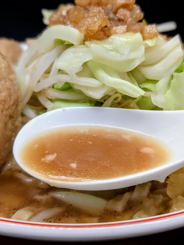 スープは臭みのない豚骨醤油で、カエシの味からは二郎インスパイアを意識したカネシ緑ラベルの存在を感じますが、塩分濃度は約2.3%、Brix値は約11.1%とインスパ系の枠内では比較的やや薄口で、上品かつあっさりまろやかなあまうま味となっています。