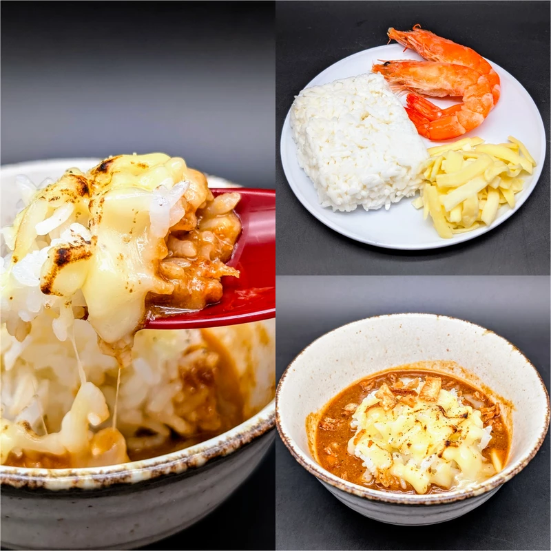 麺が終わったらライスをレンチンしてスープをかけ、チーズを散らして〆のリゾットが完成です。