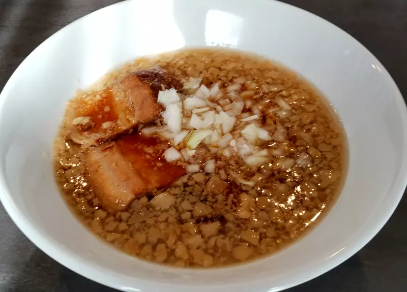 あっさりとしていますがコクもあるあまうま味で、良質なA脂を使った甘味ある大粒豚背脂もたっぷりと浮かべられており、一種のトッピング具材として成立しています。