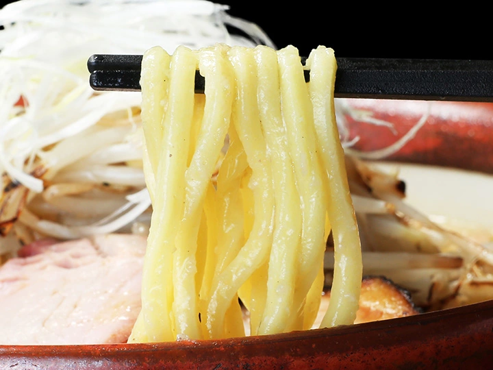 濃厚味噌スープをしっかりと受けとめる麺には、店主の出自である「味噌麺処 花道庵」と同じ、三河屋製麺製の麺を使用。麺の太さはふっくのスープに合うように調整し、濃厚味噌スープをダイレクトに味わえる、絡みの良さが特徴だ。黄色みのあるモチモチとした食感で、クリーミーな味噌のコクと麺を噛むたびに広がる小麦の香りのハーモニーが堪らない一杯だ。